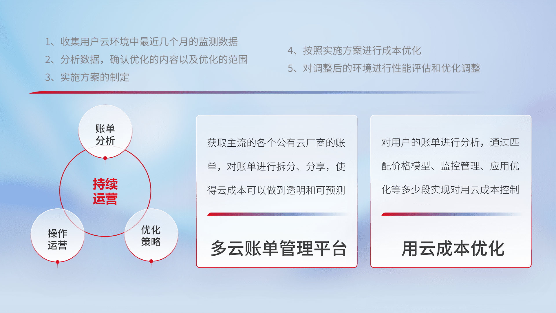 通过多云纳管,,,,以统一的资源数据模型把客户的云资源进行抽象和封装,,进而实现对多云资源的统一操作,,保障云资源管理的可靠性、、、稳定性与可用性。。。量身定制化运维内容,,,,配置、、、、开发运维、、补丁管理、、备份、、、监控、、认证和访问管理、、、、审计和日常巡检等,,,,保障在用云过程中的可靠度,,,,稳定度以及高可用率。。